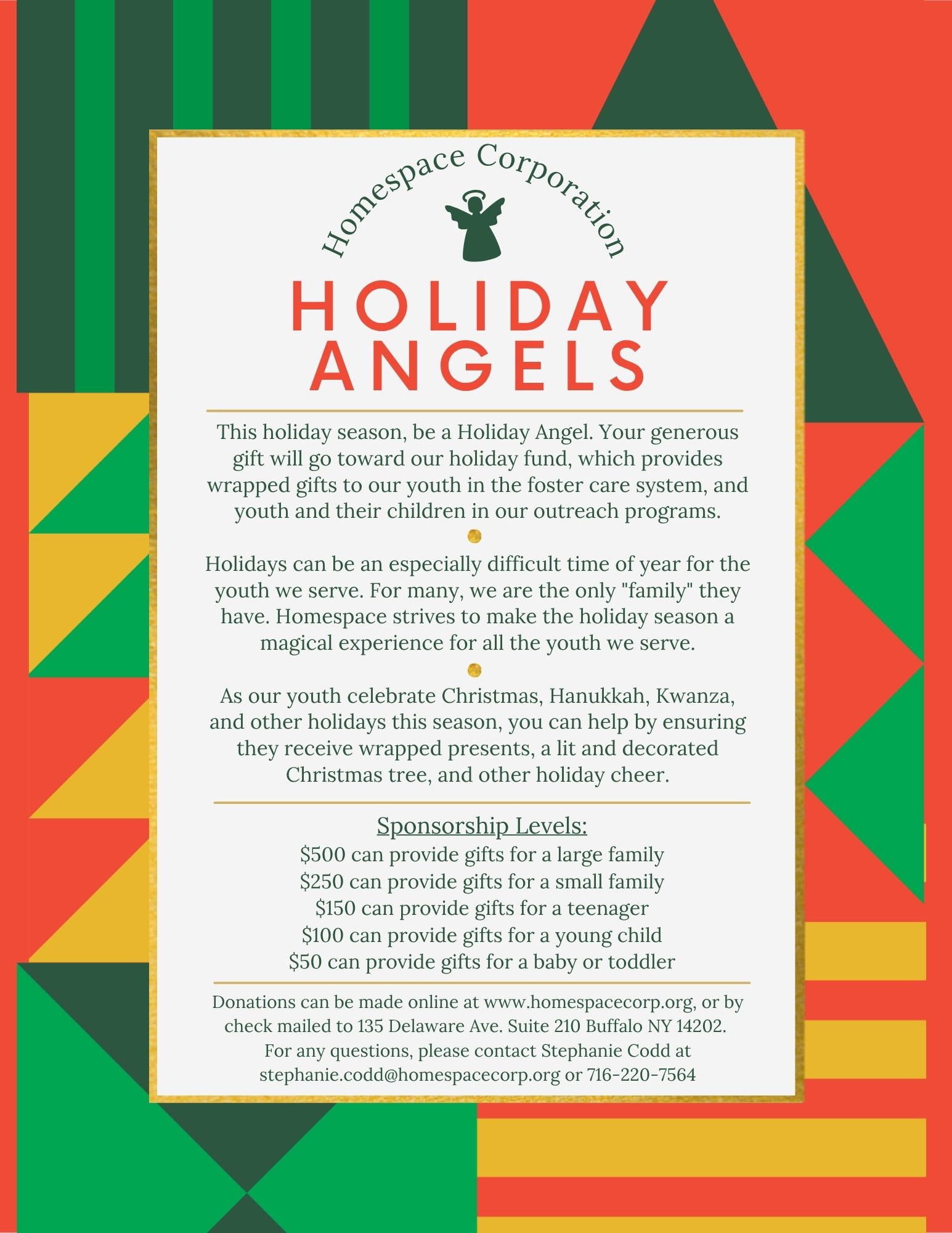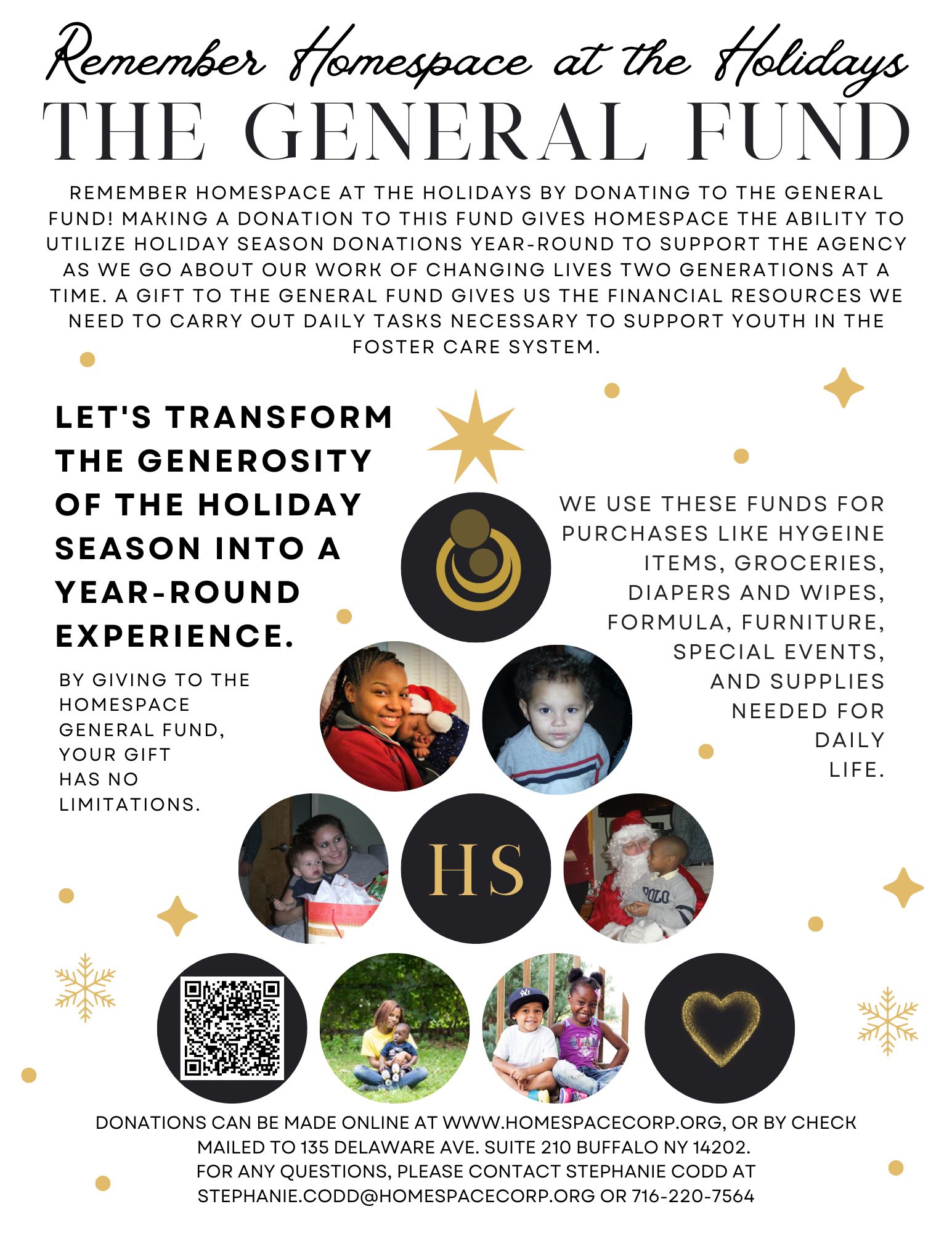 Two funds are currently open below: Holiday Angels; a space to contribute money toward Christmas gifts from Santa for children in foster care, and The General Fund; a fund that gives flexibility to Homespace and allows us to spend your money wherever it is needed most.
